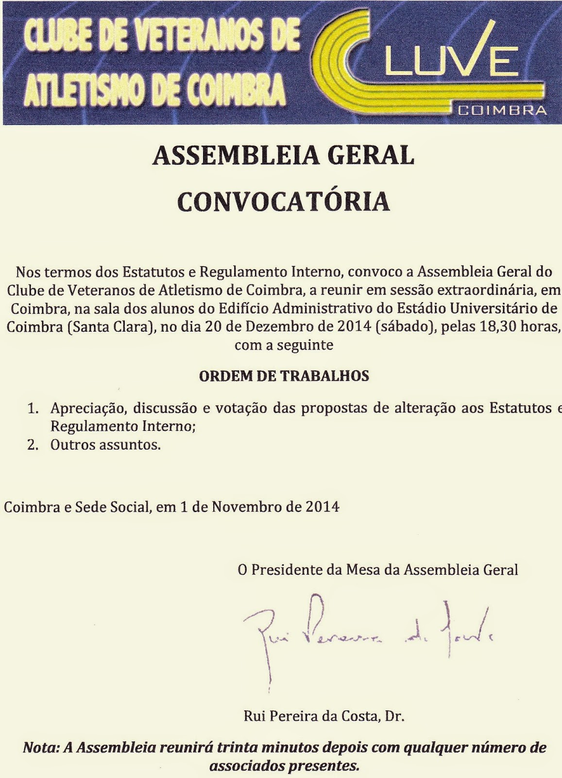 Assembleias Geral e Extraordinária do CluVe - ATENÇÃO!!! NOVA DATA ---->> 20 DEZEMBRO 2014 - Estádio Universitário de Coimbra - 17H30/18H30
