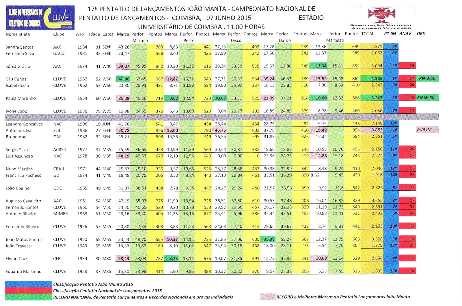 Pelo CluVe sagraram-se Campeões Nacionais do Pentatlo de Lançamentos: Céu Cunha (CluVe - W50) - 4173 pontos, Paula Martinho (CluVe - W60) - 3247 pontos e Ivone Lobo (CluVe - W75) - 2036 pontos. No masculino temos os seguintes campeões nacionais: Fernando Ribeiro (CluVe - M55) - 2163 pontos, João Matos Santos (CluVe - M65)- 3328 pontos, e Eduardo Martinho (CluVe - M85) - 1695 pontos.